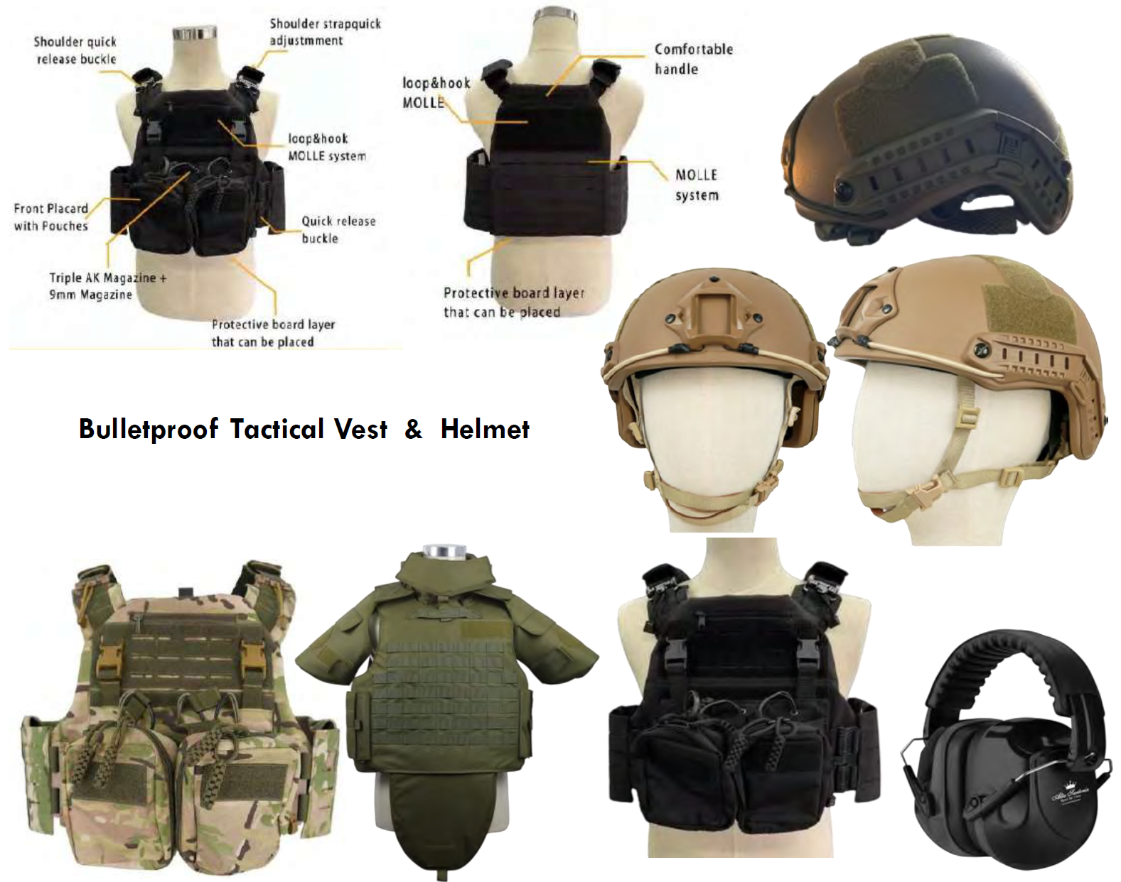 Supply military tools, tactical gear, bulletproof vests, helmets, weapons bags, and specialized equipment for defense forces.
